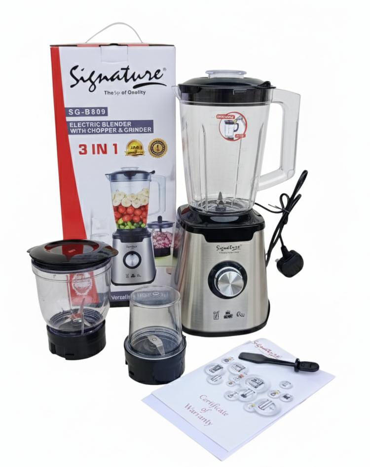The Signature SG-B809 3-in-1 Blender is your all-in-one kitchen solution for blending, grinding, and chopping. Equipped with a powerful 450W motor, sharp stainless steel blades, and a durable polycarbonate jar, it delivers smooth results every time.